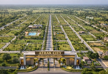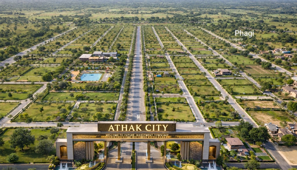 ATHAK CITY is a thoughtfully planned 100 bigha real estate project located in Phagi, Jaipur. The project enjoys excellent connectivity, situated approximately 40 km from Jaipur Airport, Bus Stand, and Railway Station. It is just 1 km from the proposed expressway highway, ensuring fast and smooth access, and lies within 5–10 km of the upcoming Knowledge City, Jaipur, making it a promising destination for future growth, investment, and modern living.
